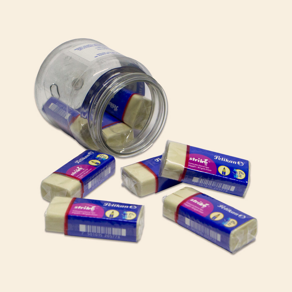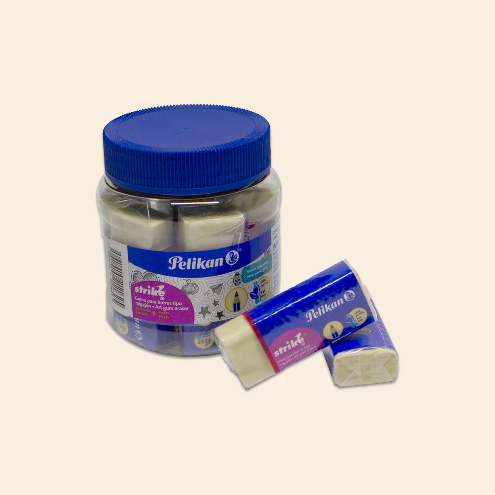Goma Strike-20 Pelikan de alta calidad, presentada en práctico barril con 8 piezas. Ideal para oficina, escuela y uso profesional. Borrado limpio y eficaz sin dañar el papel. Diseño ergonómico que facilita el agarre durante largas jornadas de trabajo. Perfecta para estudiantes, dibujantes y profesionales que requieren precisión y confiabilidad. Marca reconocida internacionalmente por su durabilidad y desempeño superior.
